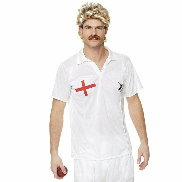 You can't beat a bit of Beefy when it comes to beating the Aussie's in the Ashes. Bowl back to the 80's in this super star cricket player outfit. This costume includes a white, polo-style t shirt with twin cricket bats print over the left breast and a red and white England flag over the right. Pair with the matching white trousers and the iconic blonde moustache. Wig, shoes, moustache & cricket ball not included