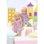 BABY borns dresses are perfect for a city trip. They are chic, playful and comfortable. You can sit in the ice cream parlour, go to the cinema or take a walk. The purple dress with frilly sleeves is sprinkled with confetti. Popcorn florets and a bow in the rabbits hair are sown on also. The pink dress shows BABY borns favourite city BABYlon with an airplane patch above the clouds. One dress supplied. Style selected at random.