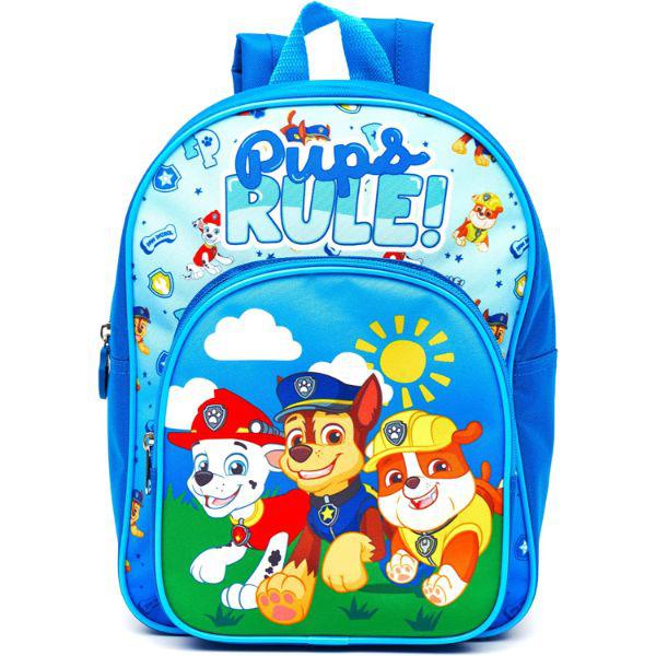 Description: Paw Patrol themed backpack in a Pups Rule design with Chase, Marshall & Rubble on the front pocket. Padded adjustable straps for comfort when carrying & hanging hook. Great for use at nursery or pre-school