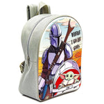 - Mandalorian themed backpack featuring a fun 3D EVA Baby Yoda design with the Slogan "Where I Go He Goes"