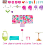 - Includes: Barbie Vacation House, 1 hammock swing, 1 couch, 4 chairs, 1 end table, 1 dining table, 1 lamp, 1 plant, 1 towel, 1 blanket, 1 toothbrush, 1 dog bowl, 1 cupcake tray, 1 popcorn bowl, 1 cake, 1 gift box, 1 puppy figure, 1 juice jug, 4 cups, 4 plates, 2 hangers, 1 frying pan and 1 egg carton