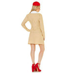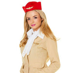 Description: Get ready to join the Mile High Club in this super-stylish Air Stewardess outfit. This five piece look features a gorgeous beige jacket with hip pockets decoration and Velcro fasteners to the front, gold wings badge and gold button decoration, a white shirt insert and a classy, white scarf. Finish off your Air hostess look with the flattering, beige pencil skirt with red A line pleat detail, and a cute, matching red hat complete with gold badge. Ready to take off (Shoes not included)