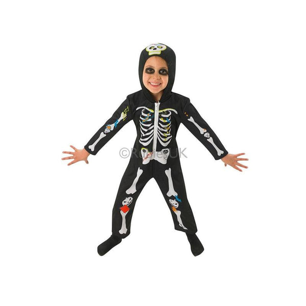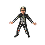 Zip up your spine and show off your bones in this spooky and fun hooded Skeleton costume! See your white ribs glow in the dark, along with the bats that have fled the belfry for Halloween.