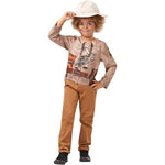 Description: Imagine stepping back in time and meeting a dinosaur, face to face! This hat and printed T-shirt will have you ready for the adventure: you’ll spot binoculars, a compass, dino fang, plus a satchel and bone around the back. The hunt is on! This brilliant kid's Dino explorer costume is ideal for any little Palaeontologist out there! Includes a long sleeve top and hat.