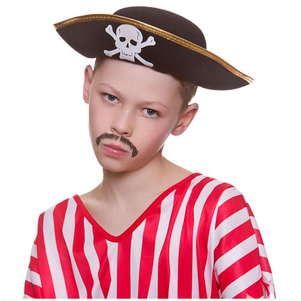 Description: Black felt hat with gold trim & skull and crossbones logo. Perfect finishing touch to any child pirate costume.