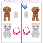 To discover Barbie doll's look, fill the tube with warm water, dip her in, swirl andsurprise! The water has a cool metallic effect, and when the doll is pulled out, her look is revealed! Repeat the same steps with the two Color Reveal pets.