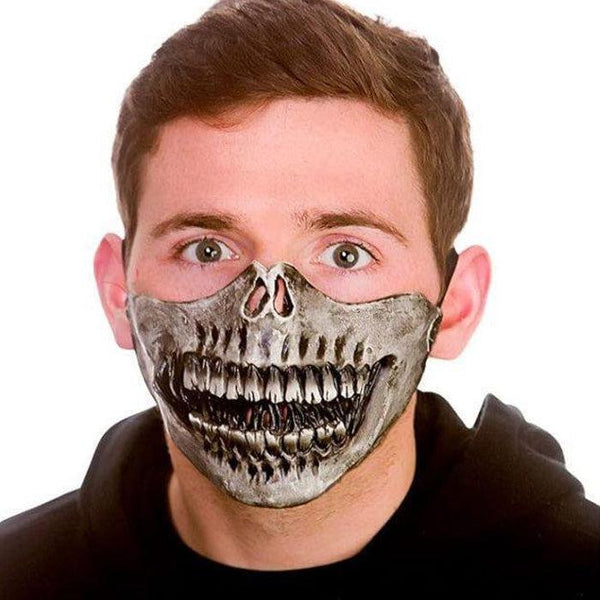 Description: Give the party guests the shivers when you wear this frightening mask! This Adults Skeleton Half Face Mask is made from latex and features a silver metal finish skeleton jawbones with bared teeth. Ideal for Halloween and horror night parties.