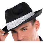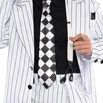 Description: This pinstripe daddy costume is part dapper and part gangster. Featuring all over black-and-white pinstripes, this suit has a sports coat with shiny black buttons and matching wide-leg pants. On the trousers is a hanging double-strand silver chain plus a pair of real braces for a perfect 1920s look. The conveniently elastic necktie and the black fedora complete this Pinstripe Daddy Costume.