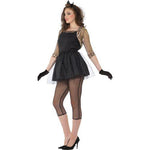 Description: Ultimate costume to recreate your favourite 80s Pop Star outfit! Costume includes black top with laced details, black tutu skirt, semi-transparent jacket with leopard print detail, soft black gloves and laced black headband.