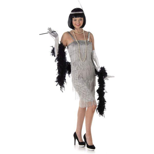 Description: This silver Charleston costume for women consists of a dress, a headband and a pair of gloves. The dress has some silver fringes and glittery straps so you bring a glamourous touch to the outfit. Straps are elastic and a zipper is at the back for the closure. The sequins headband has a silver feather and long gloves easy to put on. Change into a 20's diva with this outfit for a Charleston dressed up party !