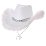 Description: White Cowgirl Hat with Marabou Feather. Ideal for any western, Wild West, Rodeo, Country Western themed event