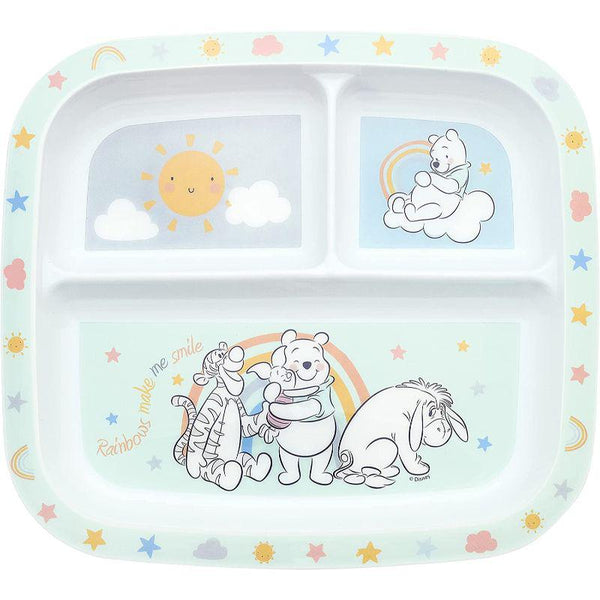 Description: This reusable Winnie the Pooh divided dinner plate with 3 sections keeps food separate for picky eaters and is perfect for little ones wanting to eat with these cute and cheeky friends. The PP plastic is food-safe and easy to clean (hand wash only). Great for everyday use at home, to take to the grandparents or for taking on holiday to minimise routine disruption at mealtimes.