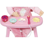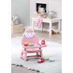 Baby Annabell already eats puree. But we havent yet figured out which kind she really likes. The pink chair with its lamb backrest and table can help with that.