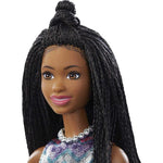 - Brooklyn Barbie doll shines in a shimmery dress, necklace, shoes, and a trendy top knot hairstyle with baby hairs