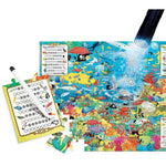 - Contents: puzzle 60 x 44 cm 70 pieces; marker and eraser; uv torch (works with 3 x 1.5v AA batteries not included)