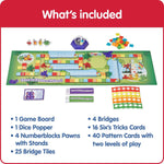 - Includes: 1 game board, 1 dice popper, 4 player pawns, 25 bridge tiles, 4 bridges, 16 Six’s Trick Cards, and 40 pattern cards with 2 levels of play