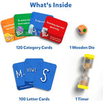 - Includes: 120 Category Cards, 100 Letter Cards, 1 Timer & 1 Wooden Die