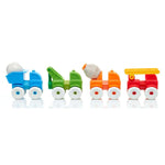 - Includes: Blue dumper truck, in 2 pieces, Green truck with crane lift, in 2 pieces, Orange cement mixer, in 2 pieces, Red truck with ladder, in 2 pieces, 4 magnetic joining posts & 1 magnetic ball