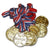 Gold plastic winners medals with red, blue and white neck cord. Superb for children's parties and sports day!