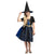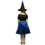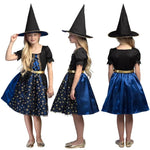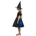 A magical witch costume. This cute children's costume consists of a pretty dark blue dress with gold stars and gold belt. In addition, the costume also has a pretty black witch hat to complete the outfit. Dressing up as a witch during Halloween remains fun for girls.