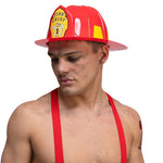 This is a plastic red hat with a yellow sticker design and the words ‘fire chief’ on the front