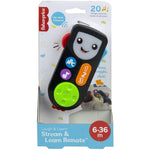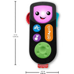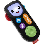 Description: Baby can tune-in to fresh educational fun with the Laugh & Learn Stream & Learn Remote activity toy from Fisher-Price. This pretend remote control looks just like the grown-up version but it's sized just right for small hands to grasp, press, click and toggle. When your baby presses the ABC, 123 or music buttons, they'll hear 20+ songs, sounds, and phrases about the alphabet, counting, and colours as the friendly faced screen lights up. Additional busy activities like a toggle switch, spinner and directional button help strengthen baby's fine motor skills (Plus, they're fun)!