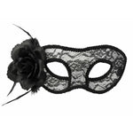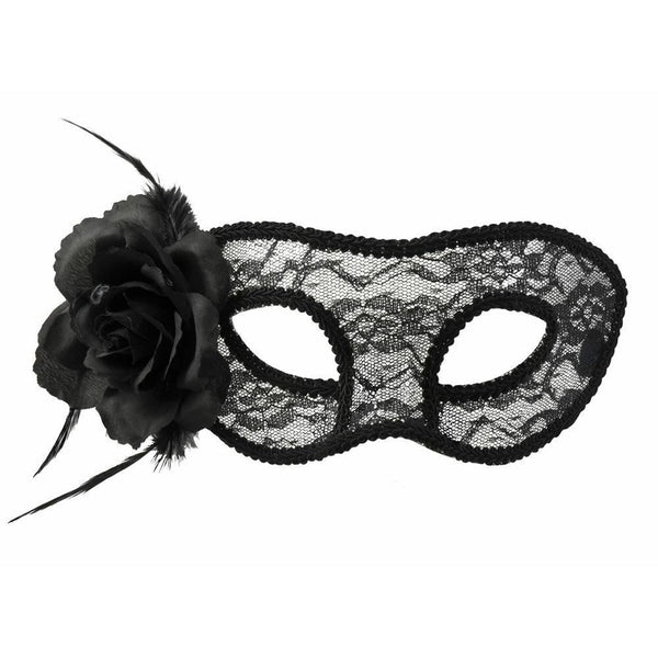 - It is made of lace and is decorated with a rose and black feathers on the side