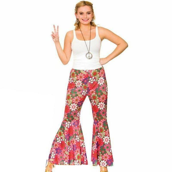 Ladies Flower Power Hippie trousers. These fantatstic bright and colourful flared trousers are simple but effective way to dress up for a 60's and 70s's themed party.