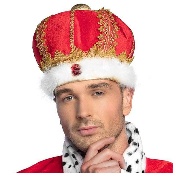 Description: This red and gold crown, from Boland, is modelled on a crown of official ceremonies. It is made of fabric and has gold-coloured borders, which characterise a precious metal crown. The large ruby artificial gemstone is adorned with white feather jewellery. With this crown, you can embody your status as the king of the evening, or as the Prince of the Orient at any party.