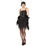 Description: This black Charleston costume for women consists of a dress, a headband and a pair of gloves. The dress has some black fringes and glittery straps so you bring a glamourous touch to the outfit. Straps are elastic and a zipper is at the back for the closure. The sequins headband has a black feather and long gloves easy to put on. Change into a 20's diva with this outfit for a Charleston dressed up party !
