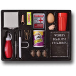Elastic bands, Small metal ring, Bogie paddles, Small pot with lid, Large pot with lid, Plastic box and lid, Dice, Card cube, Squidgy brain, Loose tooth, Brown slime, Long vein, Medium, Short vein, Dustbin with base and lid, Dustbin lid liner, Large sponge bogies, Small sponge bogies, Cockroach egg envelope, Cockroach, Poo cards, Toilet roll machine and paper