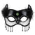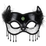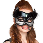 Description: Keep your identity on the next costume party and wear this great cat eye mask. The black silver mask is decorated with glittery jewels. Various beads hand down in chains and gives the mask an interesting look. The cat ears are also silvery and have black feathers. Ideal for fancy dress parties and Halloween.