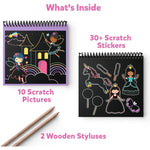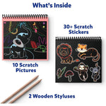 - 10 Scratch Pictures, 2 Wooden Styluses and 30+ Scratch Stickers
