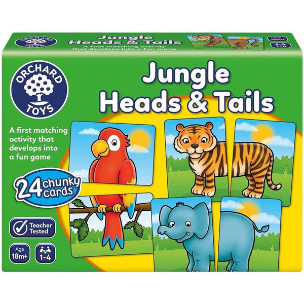 Jungle Heads and Tails is a fun first matching activity for children from 18 months that can develop into a simple game as children grow in confidence and ability. Children can be encouraged to say words aloud to develop speech and language skills. As they play, they will develop matching and memory skills and learn about turn-taking and sharing. There is lots to see including a flamingo, a parrot and a tiger!
