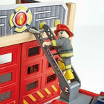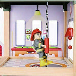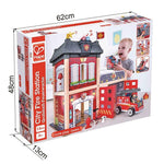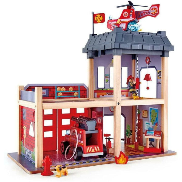 - Contains 13 pieces including 1 fire station, 1 wooden base, 1 control panel, 1 fire axe, 1 fire extinguisher, 1 Helicopter, 1 fire engine, 1 flame, 1 dog, 1 small fire, 1 Flag and 1 camera.