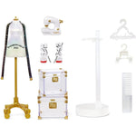 Working accessories include a Mini Sewing Machine with a spin dial and moving needle that mimics a real sewing machine; , and a Mannequin that you can roll around, and to measure fabric. Jett also has her Mini Measuring Tape.