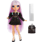 Avery Styles is dressed in a matching black with rainbow trim skirt and top. She has a gorgeous younger face sculpt, detailed features in her fashion, beautiful long straight purple and rainbow shimmer hair, long eye lashes and glass eyes. Her soft fabric satin backpack opens and closes and is the perfect accessory to match her stunning outfit and to carry around anything she needs for school. Avery always has a unique style for school!