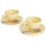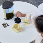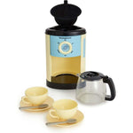 - Includes: Toy coffee maker with fillable chamber and water level indicator, coffee pot, two cups, saucers and spoons