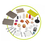 Includes 1 fridge, 1 oven, 1 gas stove with retractable flames, 1 sink with a tap, 1 cash register with a cash drawer and a credit card reader, and 2 storage shelves to store accessories. With lots of sweet and savoury foods, drinks, cutlery, cooking utensils, credit card and tickets, a salt and a pepper shakers, a frying pan to flip the pancakes, ketchup and mustard sauces children can create anything they can imagine!