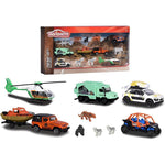- Includes 1 helicopter, 1 jeep with trailer, 1 truck, 1 car and 1 buggy. Also includes 7 animal figures