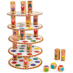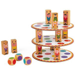 • BALANCE GAME : to play, start by placing a cardboard disc on the table. One player then rolls the 3 dice, places 3 acrobats on circles of the same colour as the dice and places a second cardboard disc on top of the pieces. The second player then rolls the dice and places the pieces as indicated by the dice, and so on. As the rounds progress, the balance becomes more and more precarious. The first player to knock down the tower loses