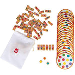 • CARACTERISTICS : contains 20 cardboard discs (10.5 x 10.5 cm/4.1inch x 4.1inch), 57 wooden pieces and 3 dice. Toy dimensions : length 9.84 inches x Width 2.17 inches x Height 9.84 inches. Material(s) used : cardboard, Wood. Recommended age range : from five years to 10 years old