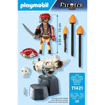 - 1 Pirate, 1 Rock with Cannon, 2 Projectiles, 1 Torch, 1 Skull, 1 Pirate Hat, 1 Headscarf with Pendant and 1 Sabre
