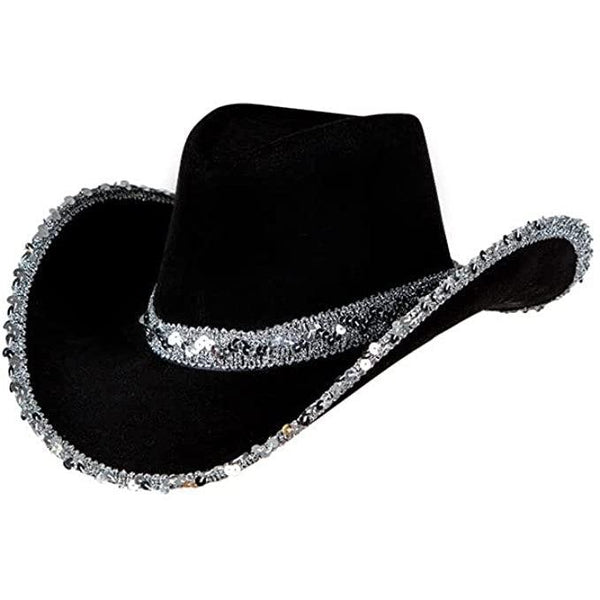 Description: Adult black Texan Cowgirl hat with silver sequin trim and band