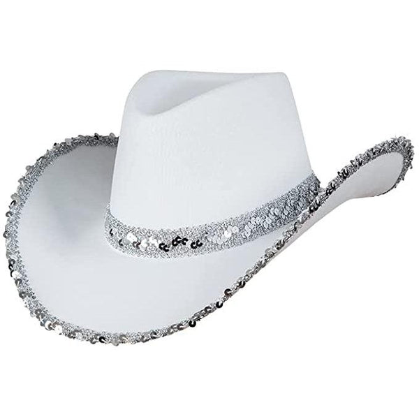 Description: Adult white Texan Cowgirl hat with silver sequin trim and band