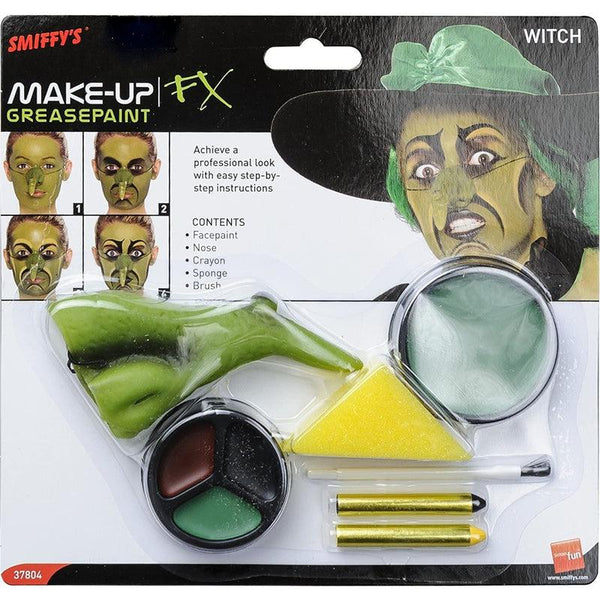 Description: Complete your witch costume with the Witch Make-Up Set. Includes face paint, nose, crayons and sponge. Suitable for ladies. Comes in green colour and is suitable for Halloween.