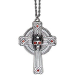 This silver chained necklace has a silver detailed cross with a sun symbol radiating from the back. There is a skull in the centre of the cross with glowing red diamante eyes, and red diamantes at the top of each point on the cross.