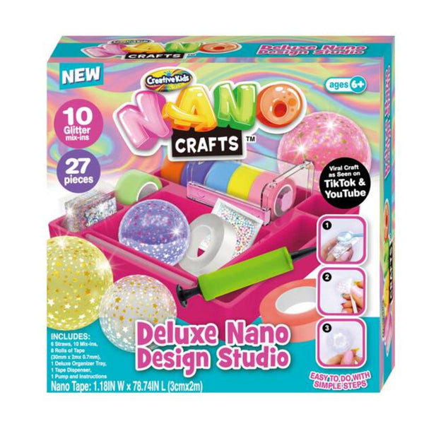 Description: Introducing the Deluxe Nano Design Studio Set from the Creative Kids Nano Crafts series, the ultimate way for children to unleash their creativity and explore the fascinating world of Nano Tape! This Deluxe Nano Design Studio Set is a treasure trove of creative possibilities, allowing children to immerse themselves in the amazing world of Nano Tape. It includes eight rolls of bright and funky Nano Tape, along with a convenient tape dispenser to keep everything organized and make the process even easier. Additionally, the set features two straws and a fantastic selection of ten mix-ins, enabling them to add unique touches and make their creations truly special. With all the necessary components at their fingertips, they can bring any idea they desire to fruition. With the Deluxe Nano Design Studio Set, children can let their creativity soar and discover the endless possibilities of Nano Tape. Get ready for a world of colourful, imaginative creations that will amaze and delight both children and adults alike!