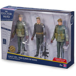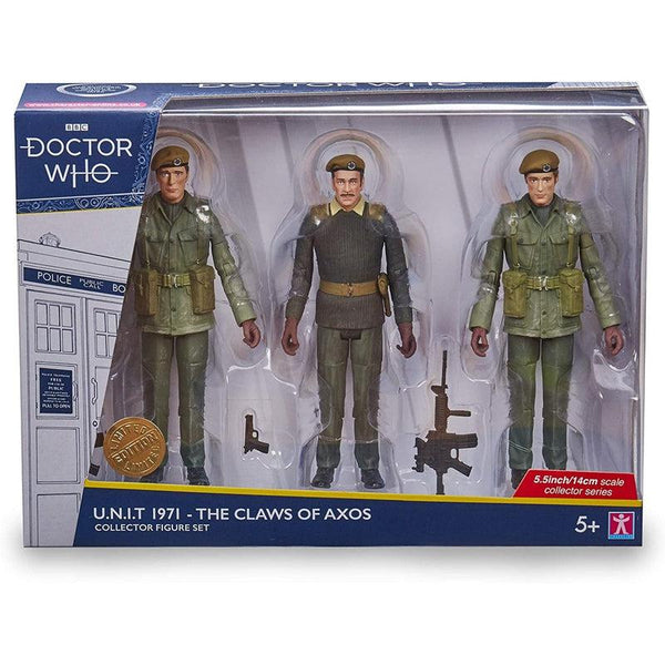 Figures are in the 5.50 inch scale and include: U.N.I.T. Members Brigadier Lethbridge-Stewart, Captain Mike Yates and Sergeant John Benton from the 1971 Third Doctor (Jon Petwee) story The CLAWS OF AXOS
