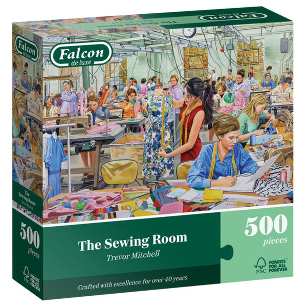 Step into a nostalgic whirlwind of creativity in this bustling sewing room, where the hum of sewing machines mixes with the sound of lively chatter! The workspace is alive with patterns and colour, with rows of talented workers cutting, stitching and transforming fabrics into beautiful garments. Illustrated exclusively for Falcon by Trevor Mitchell.